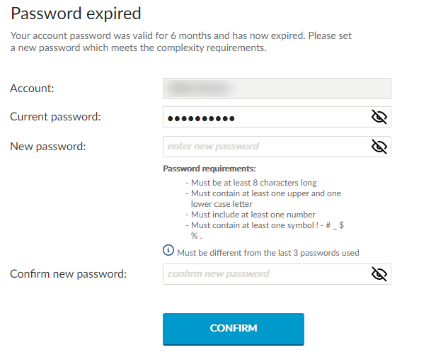 Must be different from the last 3 passwords used. Your password must contain at least an uppercase and lowercase letter and number. Must contain at least one special symbol.