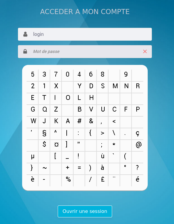You have to enter your password using this very Frenchy keypad. You don't have lowercase letters, the blanks are not spaces but just non-clickable gaps, but as a compensation you have some weird symbols that your keyboard does not have a key for (e.g. µ).