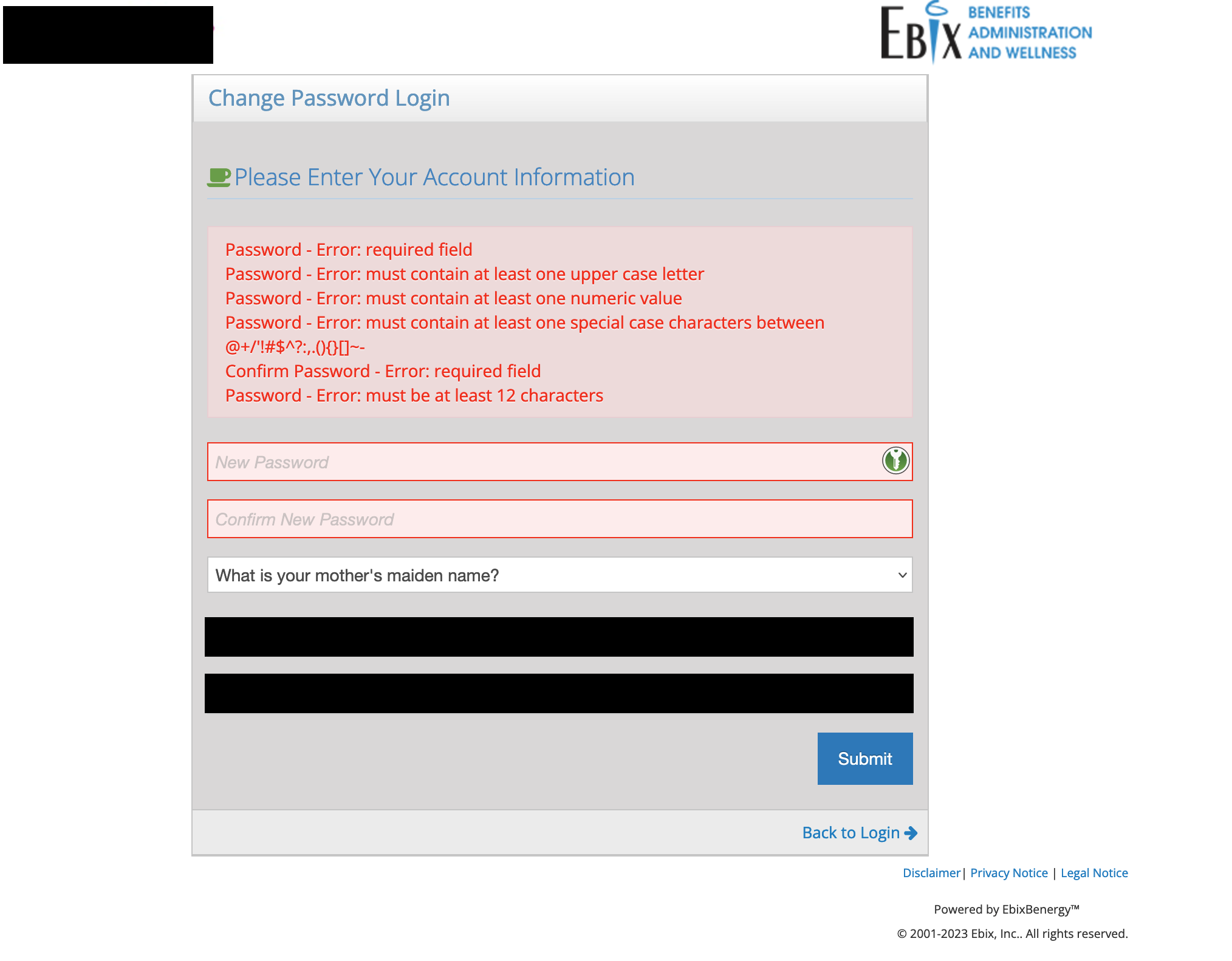 12 to 25 characters, only these special chars allowed: @+/'!#$^?:,.(){}[]~-. Also, security questions.