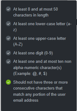 • At least 1 uppercase letter, lowercase letter, and digit, and special character.