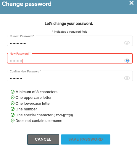 Your password can meet all the requirements in the list and still be invalid due to an unspecified rule: any "special characters" that are not listed in the help text are not allowed. Worse, it provides no useful feedback other than the "New Password" field is red.