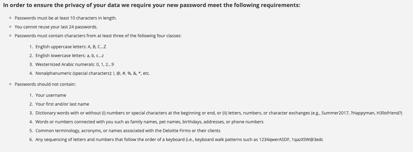 Rules that are completely arbitrary that basically make all safe passwords wrong, instead forcing pseudo-safe password combinations.