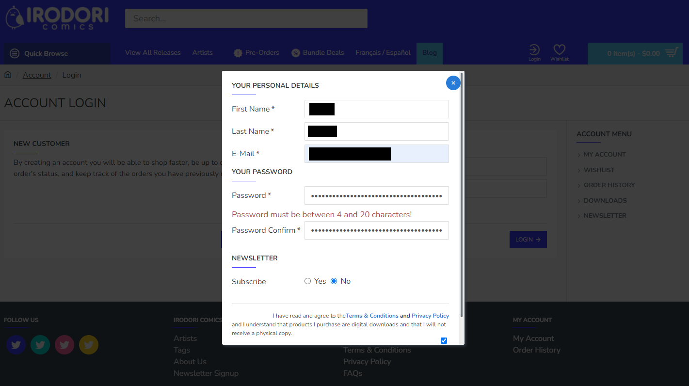 A website to buy english-localized doujins. The password must be between 4 and 20 characters long