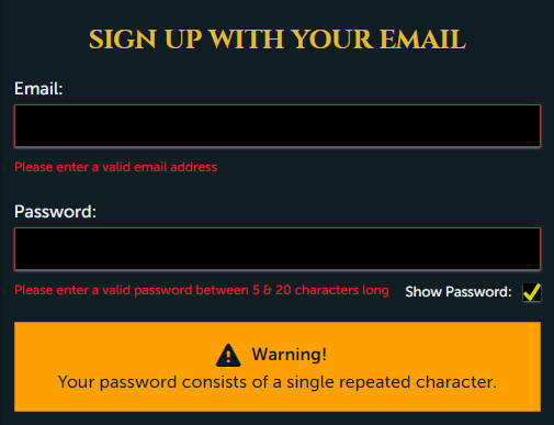 Hidden requirements: Alphanumeric only, no symbols, no repeated characters.