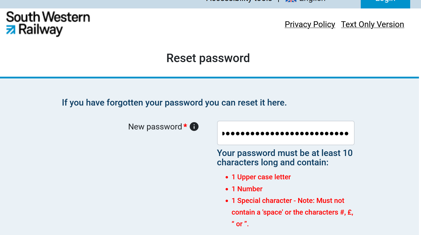 South Western Railway dumb password rule screenshot