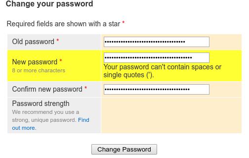 Won't allow spaces or single quotes. Maybe other characters as well - they do not say up front - but the password they accepted contained lots of other special characters.