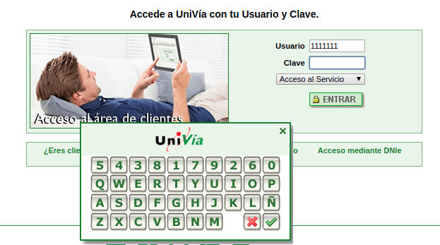 Username is your national Spanish ID (easy to find). Your password must be 6 characters long. You can't type, only select characters from the virtual keyboard
