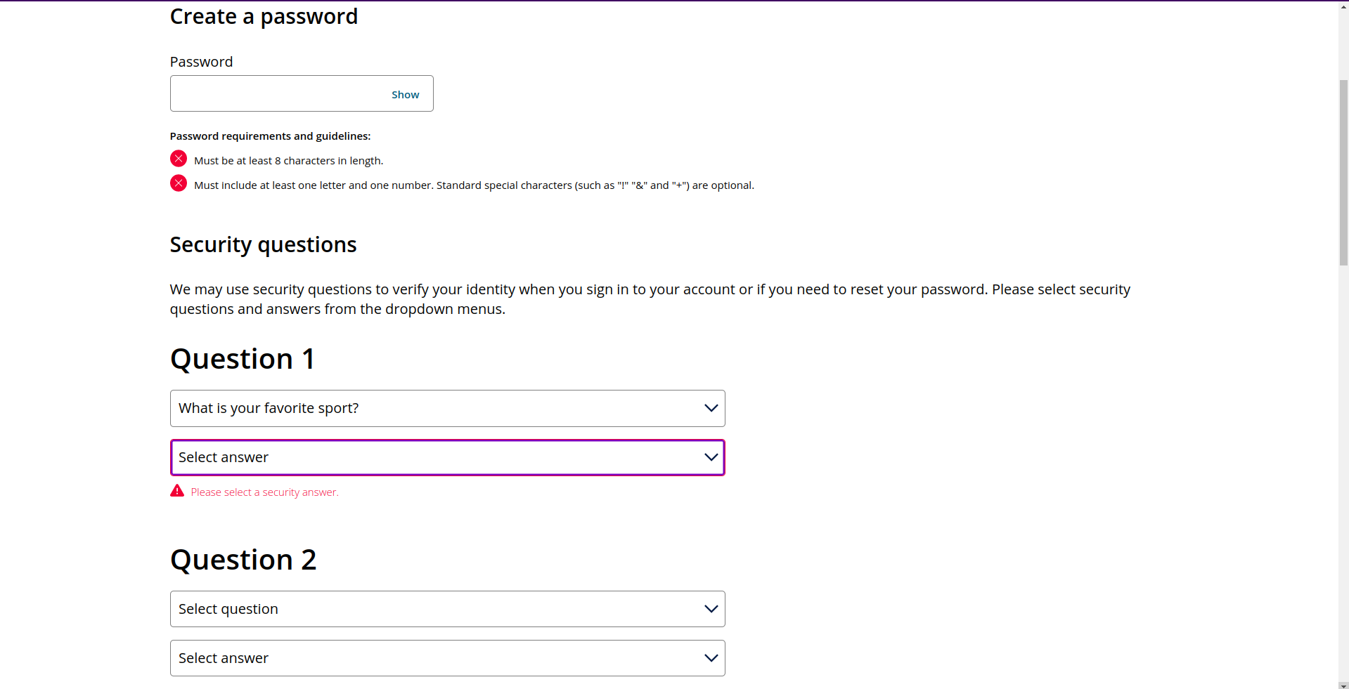 Security questions (and their answers!) must both be picked from dropdown menus with a limited number of answers and there is no option for unique answers.