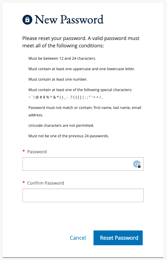 - Must not be one of the previous 24 passwords.