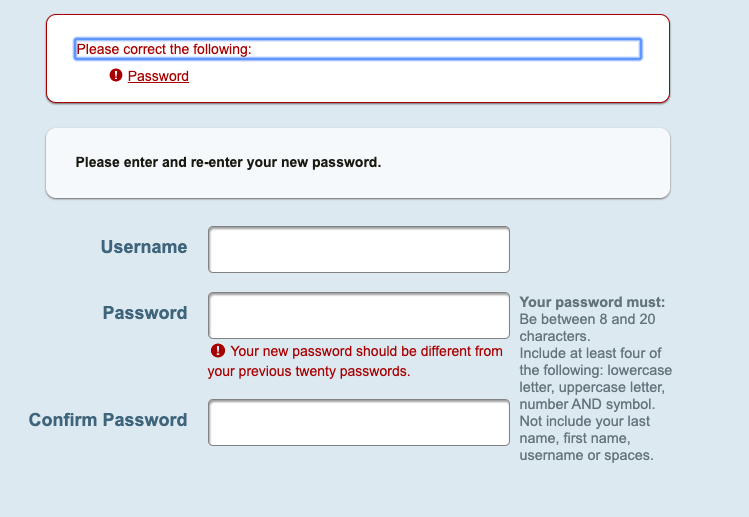 Your new password should be different from your previous twenty passwords.